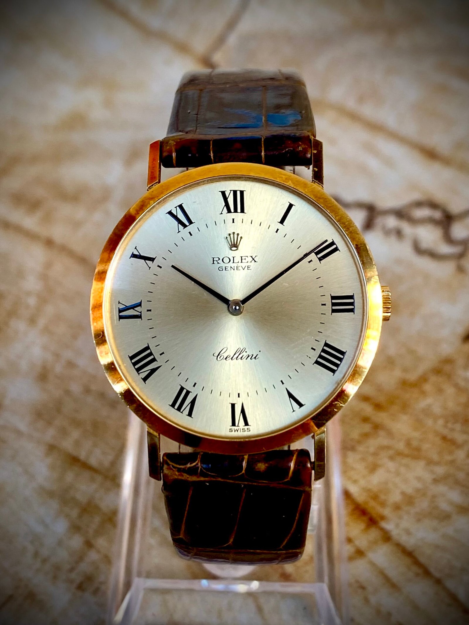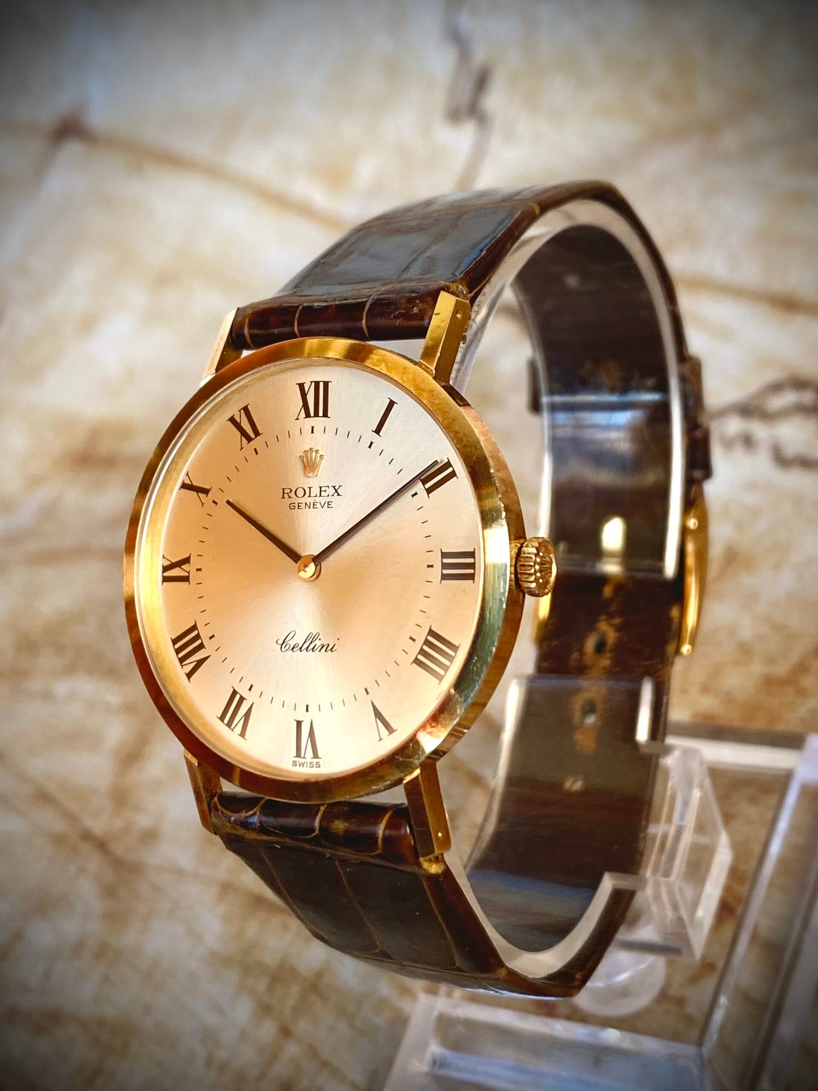 Los primeros modelos Cellini de los años sesenta y setenta se caracterizaban por prescindir de las señas de identidad más reconocibles de la marca: no utilizaban la caja Oyster hermética, carecían de corona de rosca y montaban movimientos de cuerda manual en lugar de los automáticos Perpetual. Eran relojes más delgados y refinados, fabricados exclusivamente en metales preciosos como el oro amarillo, blanco o rosa, que priorizaban la elegancia sobre la resistencia extrema.